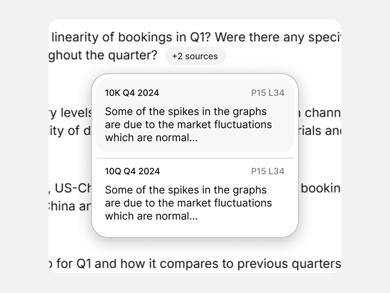 The tool produces concise summaries of earnings and corporate access calls, segmented by topic and supported with direct citations. Every insight links back to a quote or metric — so nothing is taken at face value.